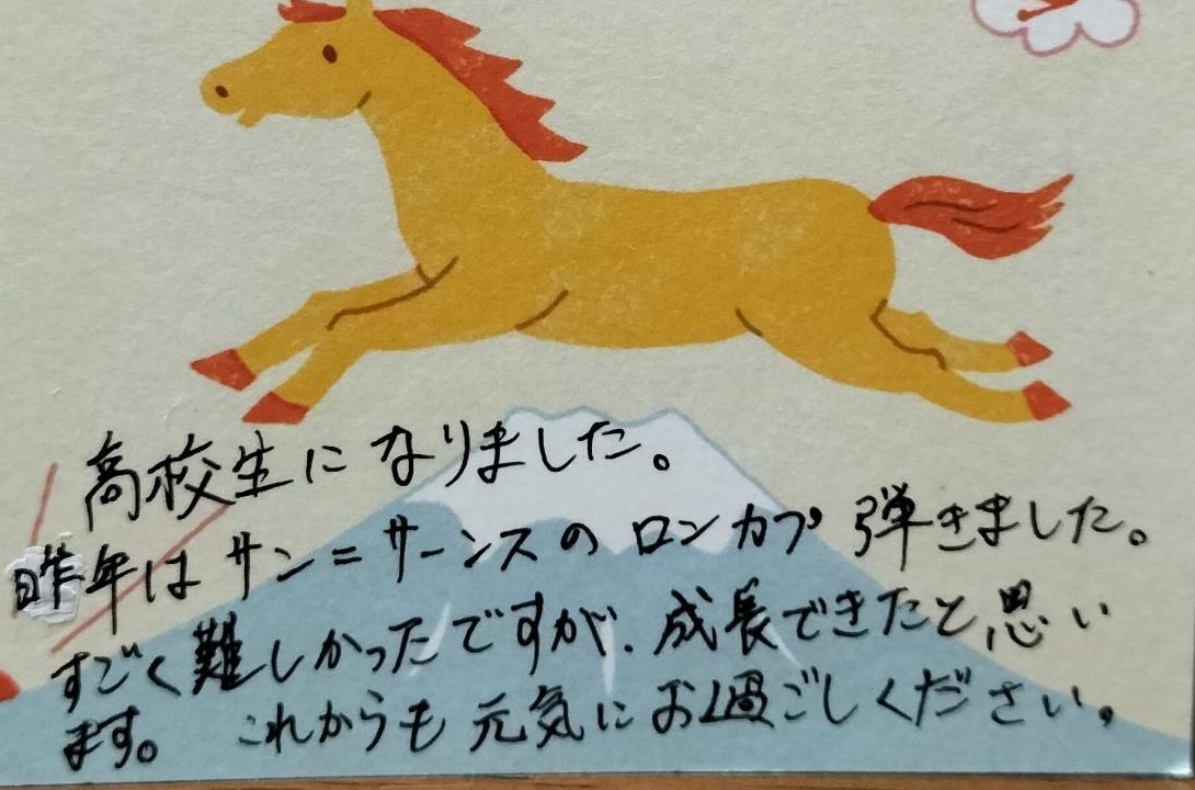 今年も高校生になったF君から年賀状が届きました♡。毎年その一年で弾いた曲やコンクールのことなどを、発表会で真剣な眼差しで演奏している写真やバイオリンを持つ笑顔の写真入りの賀状で知らせてくれます。この数年は、エックレスのソナタ、バッハの協奏曲、モーツァルトの協奏曲、チゴイネルワイゼン、ブルッフの協奏曲…と、曲の難易度や格が確実に上がっていき、会わずともバイオリンの上達は想像に難くないです。そして昨年は難曲サン=サーンスの序奏とロンド・カプリチオーソ(通称…ロンカプ)をやったと‼︎聴きたいな…どんなに上手になったことだろう…☺️