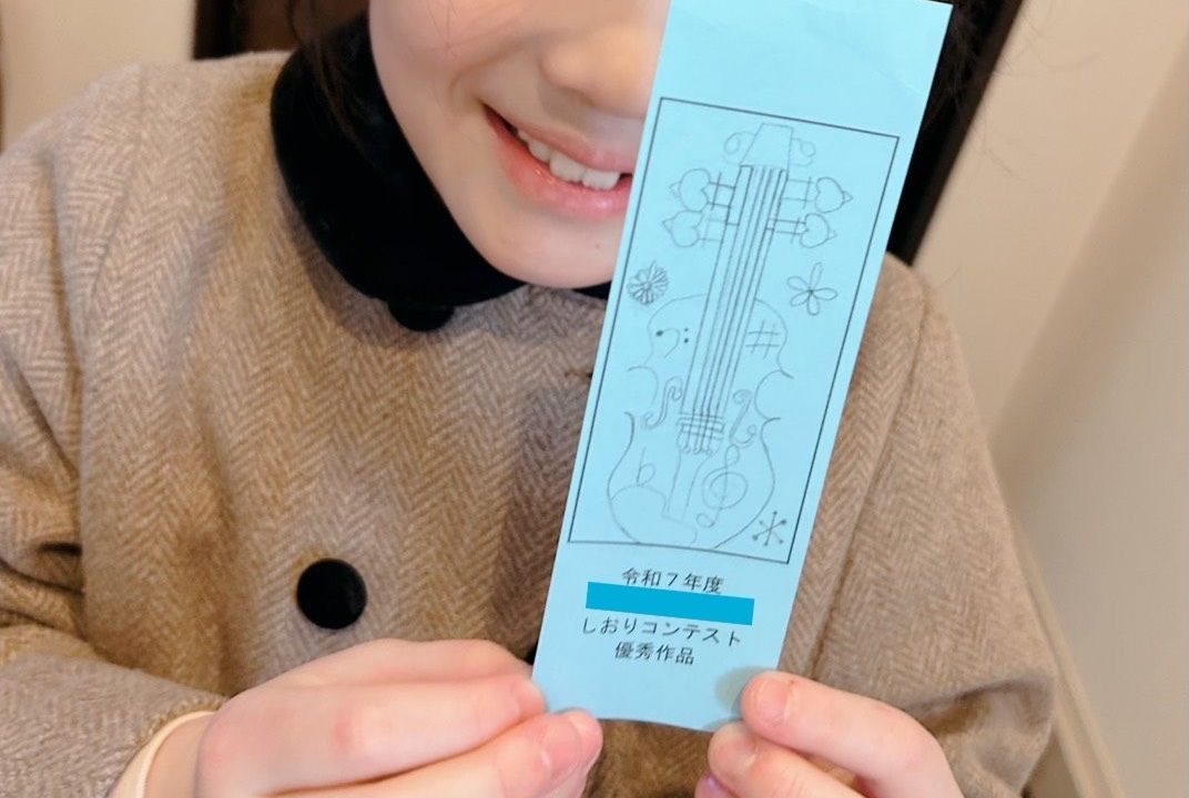 小学校のしおりコンテストに出品したバイオリンの図柄のしおりが優秀作品に選ばれたNちゃん🎊。優秀作品に選ばれた作品は、学校が何枚か複製してくれたそうで、そのうちの一つを私にくれました♡。ありがとうNちゃん!